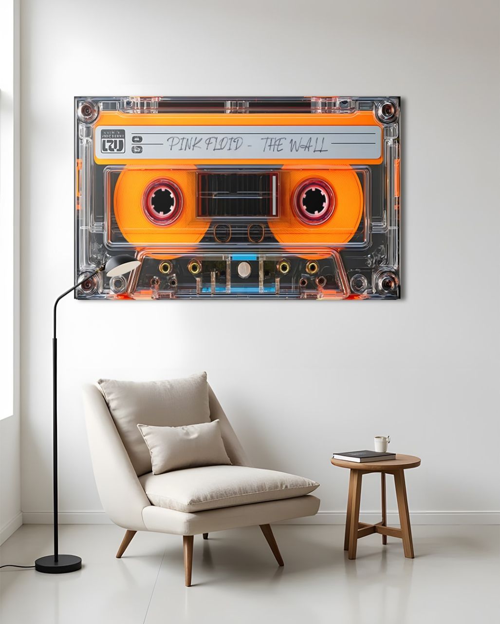a chair and a table in front of a wall with a large cassette player on it