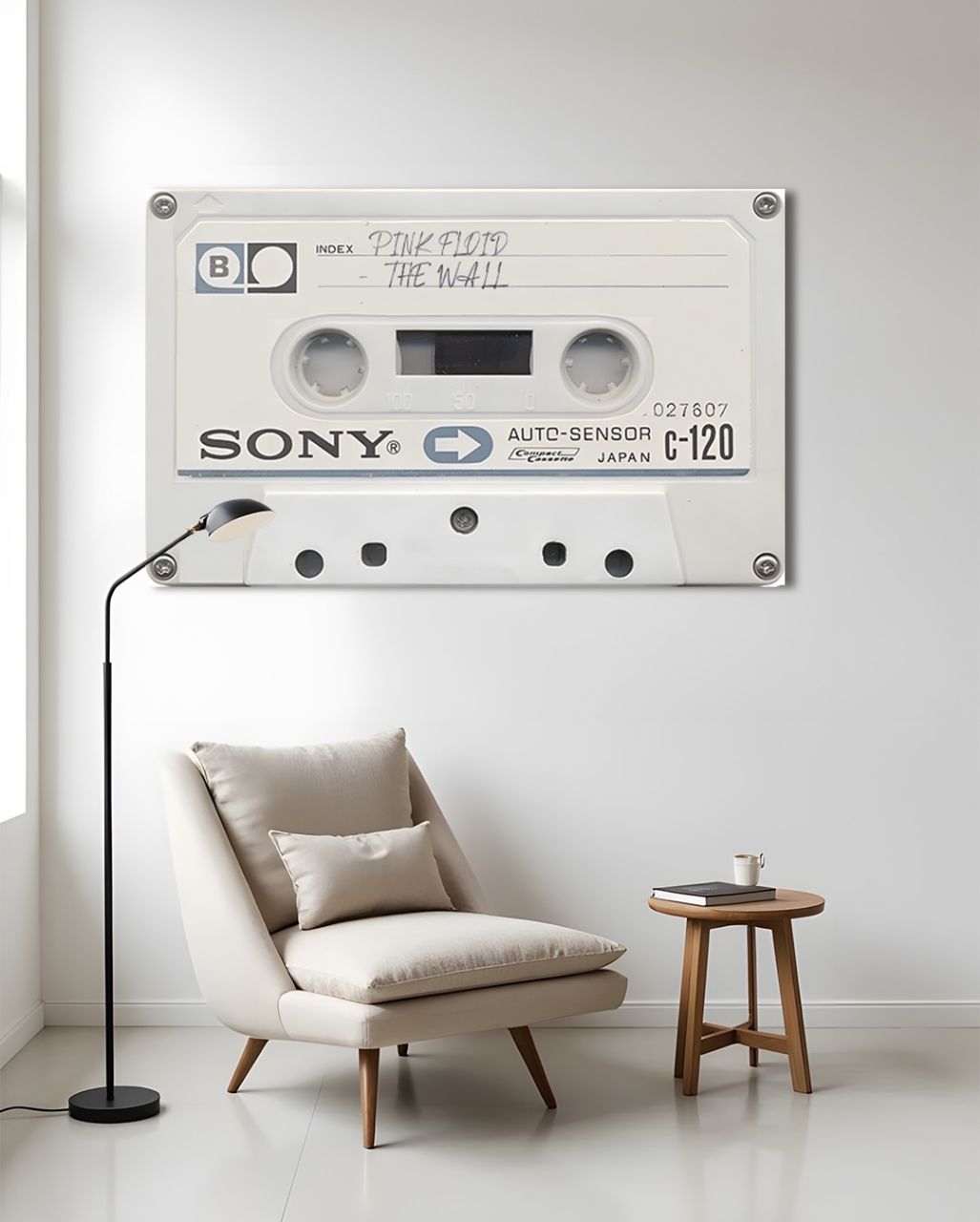 a white chair in front of a white wall with a white machine on it