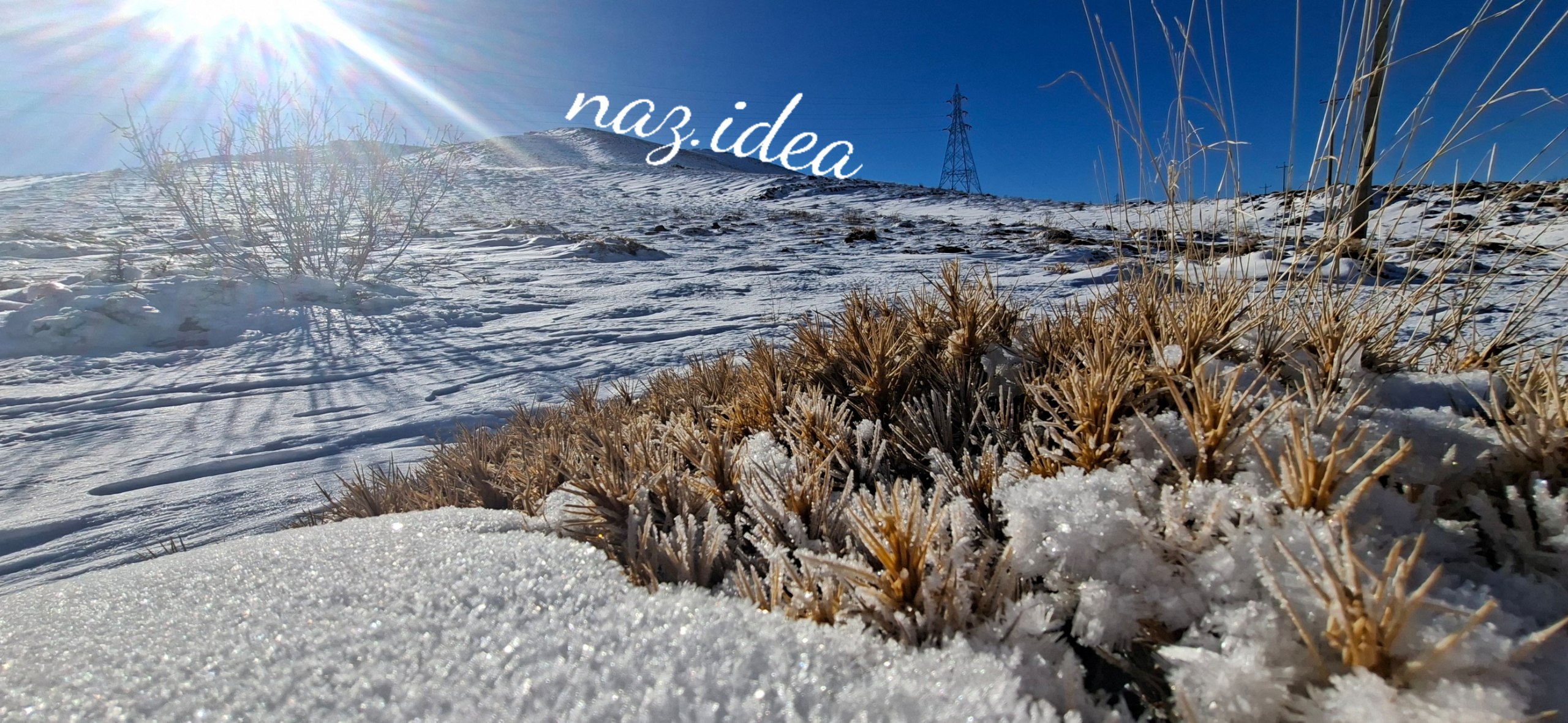 a field of snow with a tower in the background