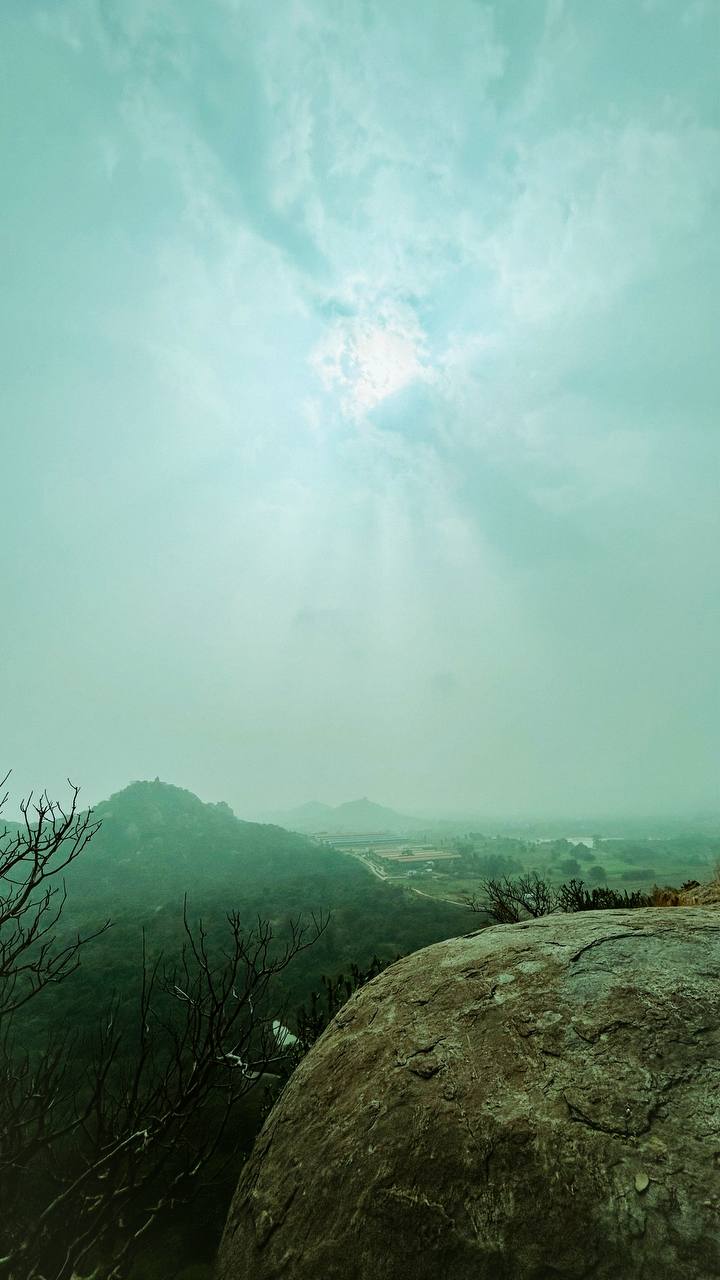 a rocky hill with trees and a valley below