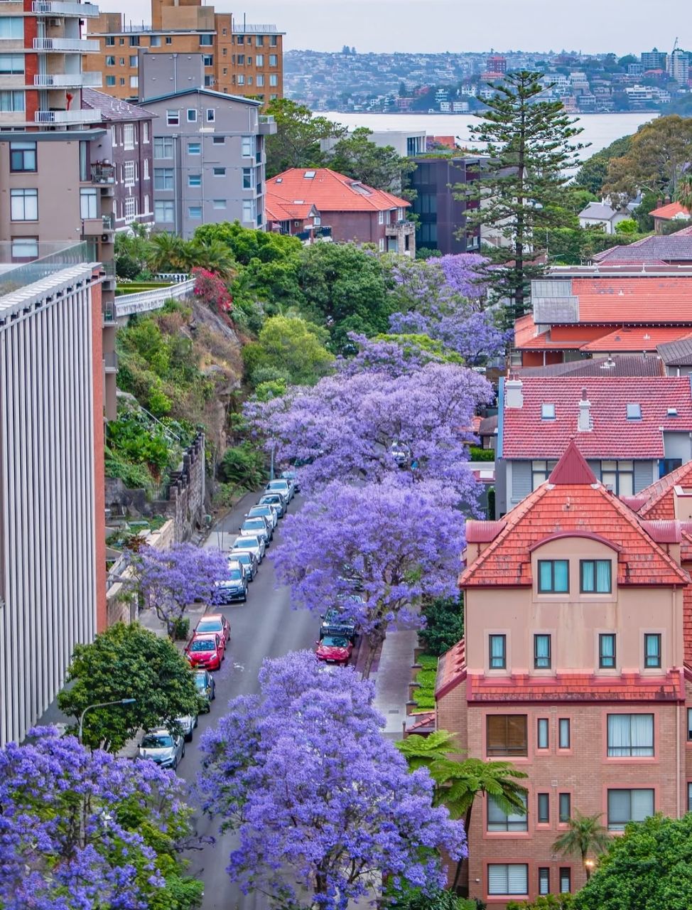 a group of buildings with trees and cars in the front with Lombard Street in the background