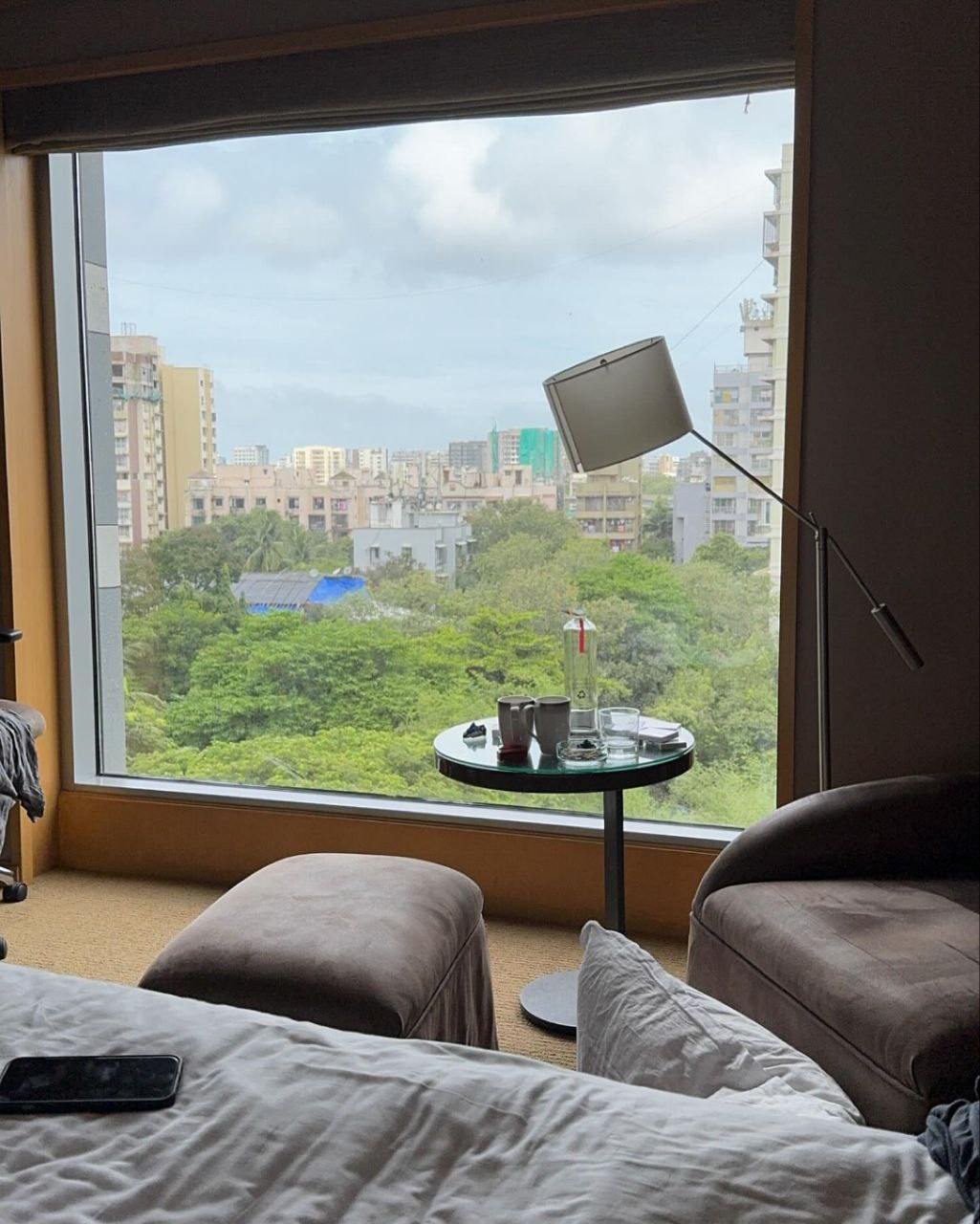 a window with a view of a city and a table