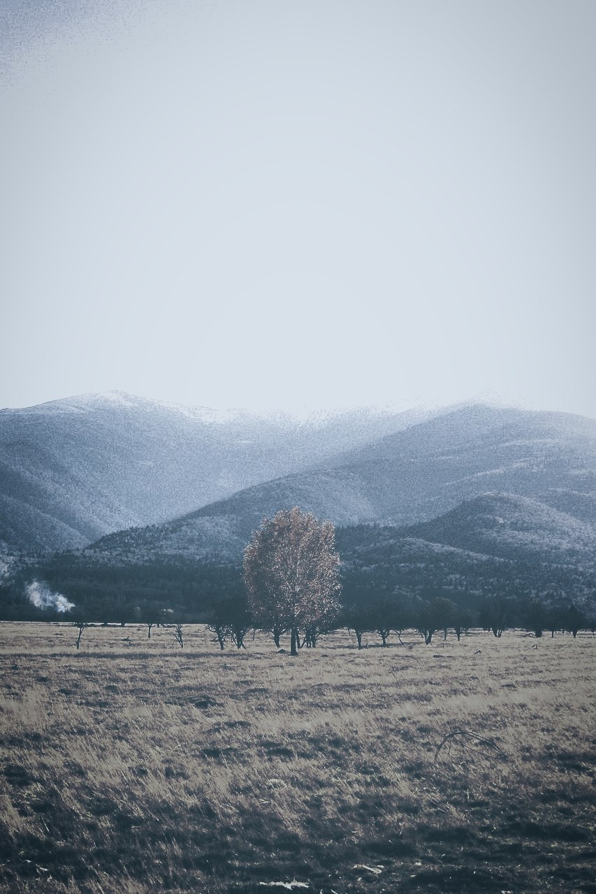 a field with a tree and mountains in the background