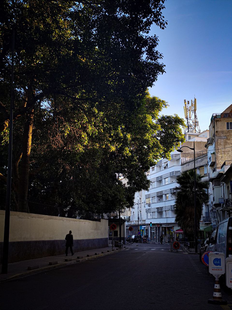 a street with trees and buildings on the side