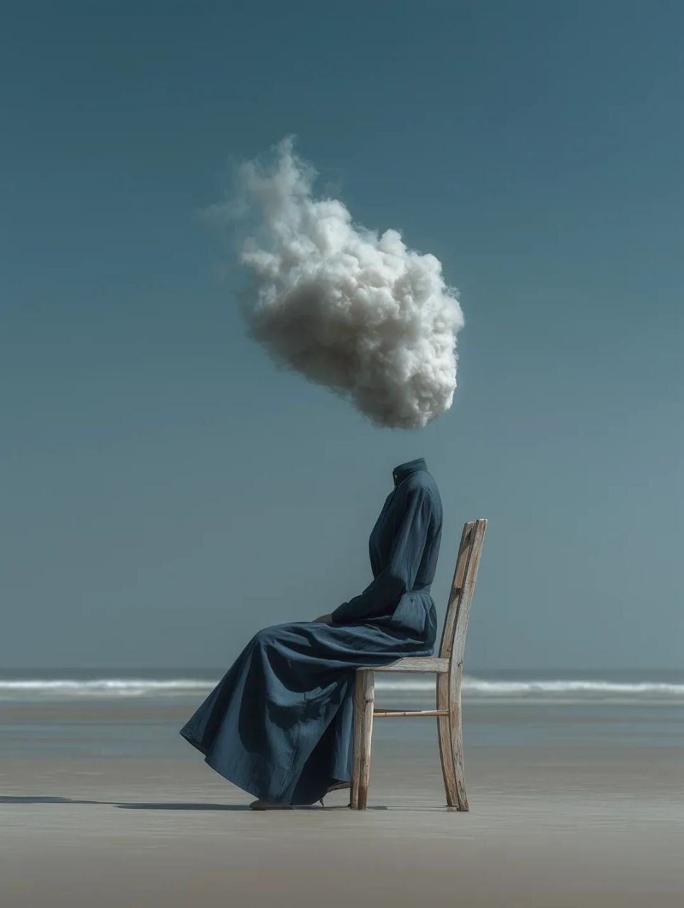 a person sitting on a chair on a beach with a cloud of smoke in the sky