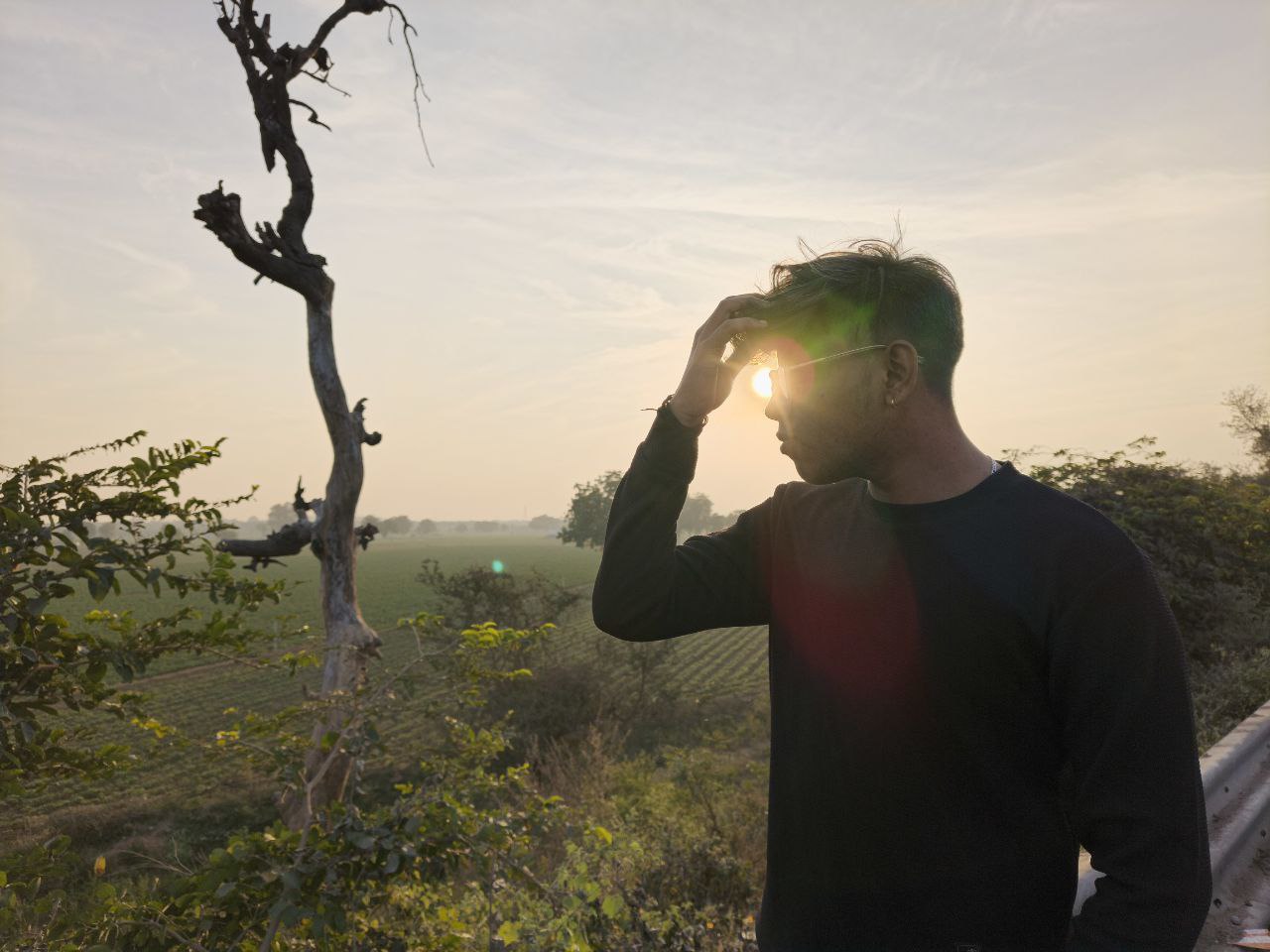 a man with a green headband and a black shirt standing in a field with trees and bushes