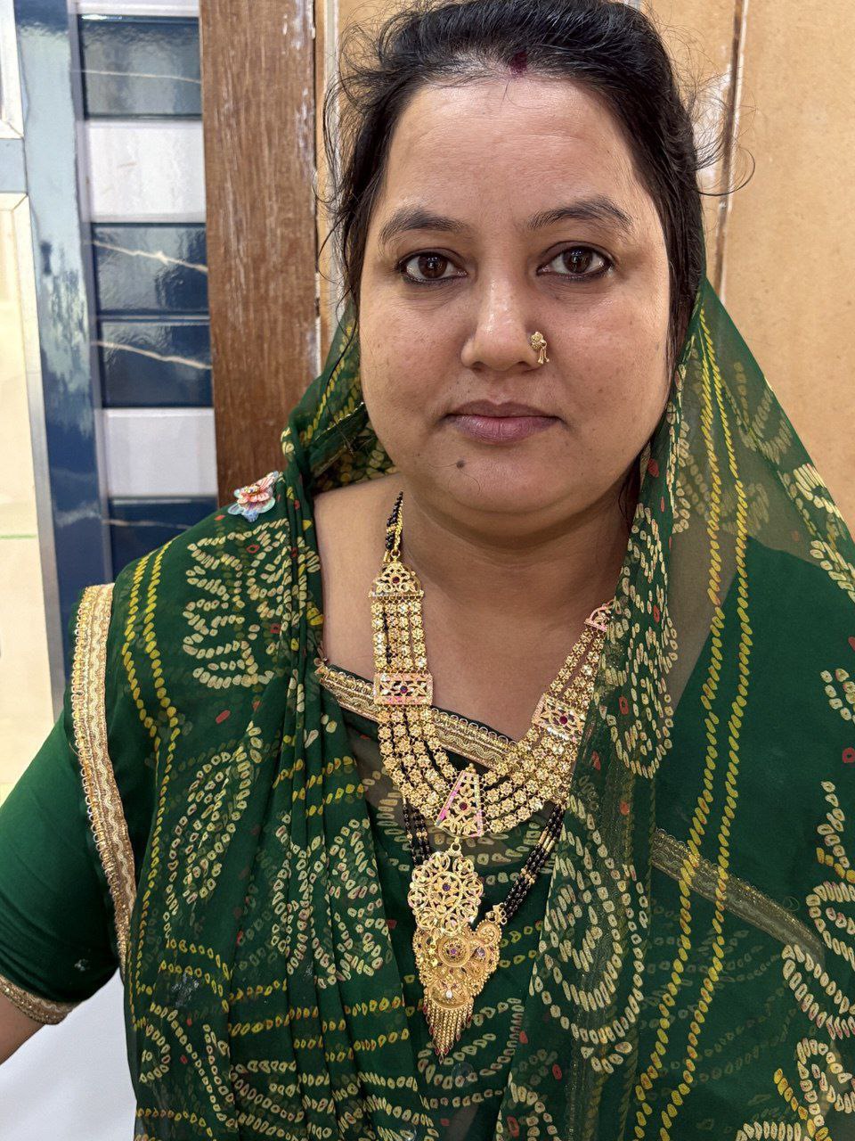a woman wearing a green and gold scarf