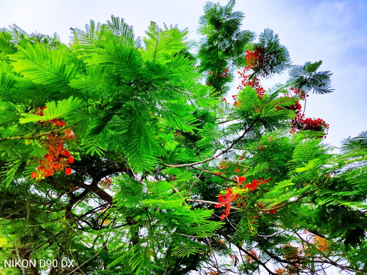 a tree with red flowers