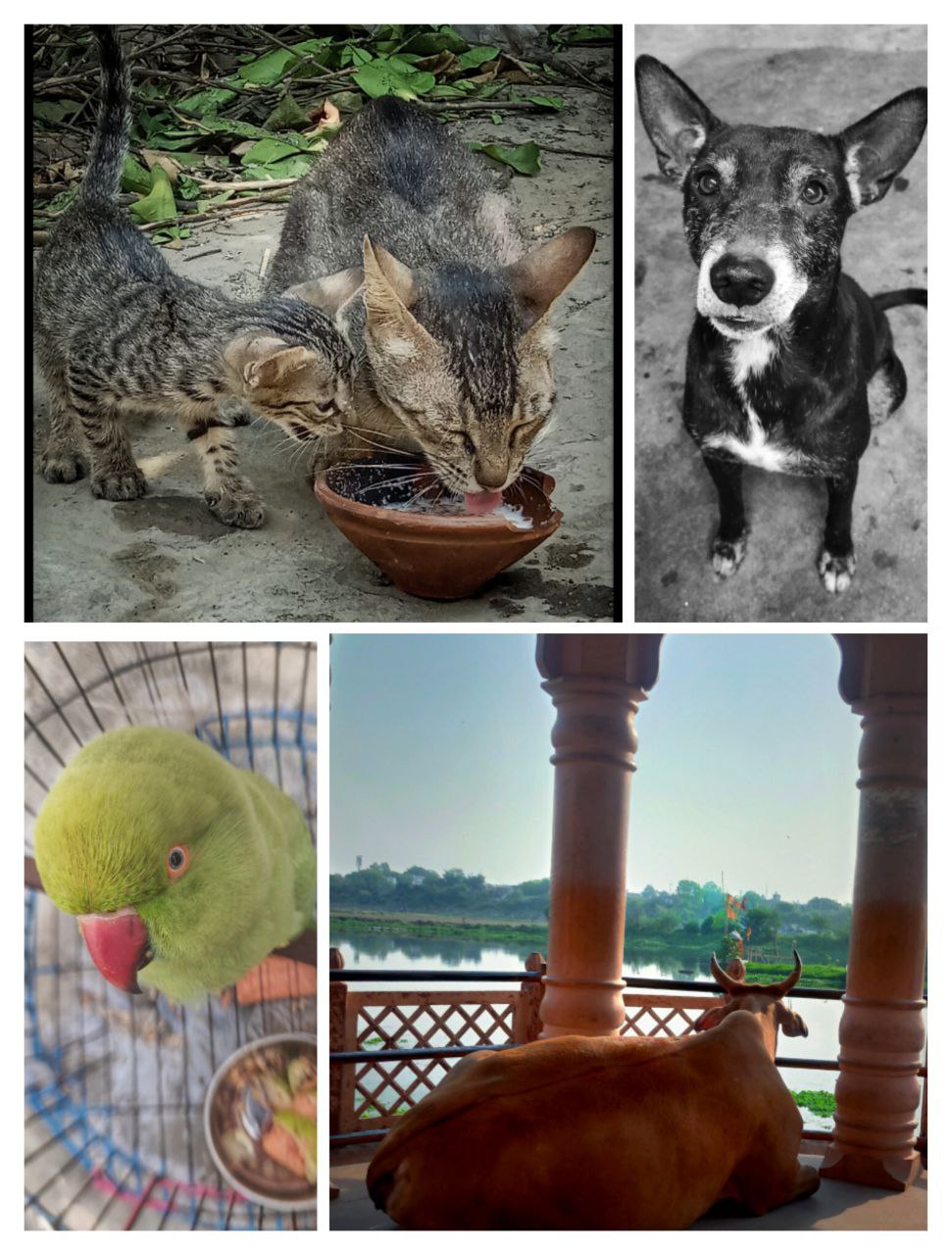 a dog and a cat looking at a bird in a cage