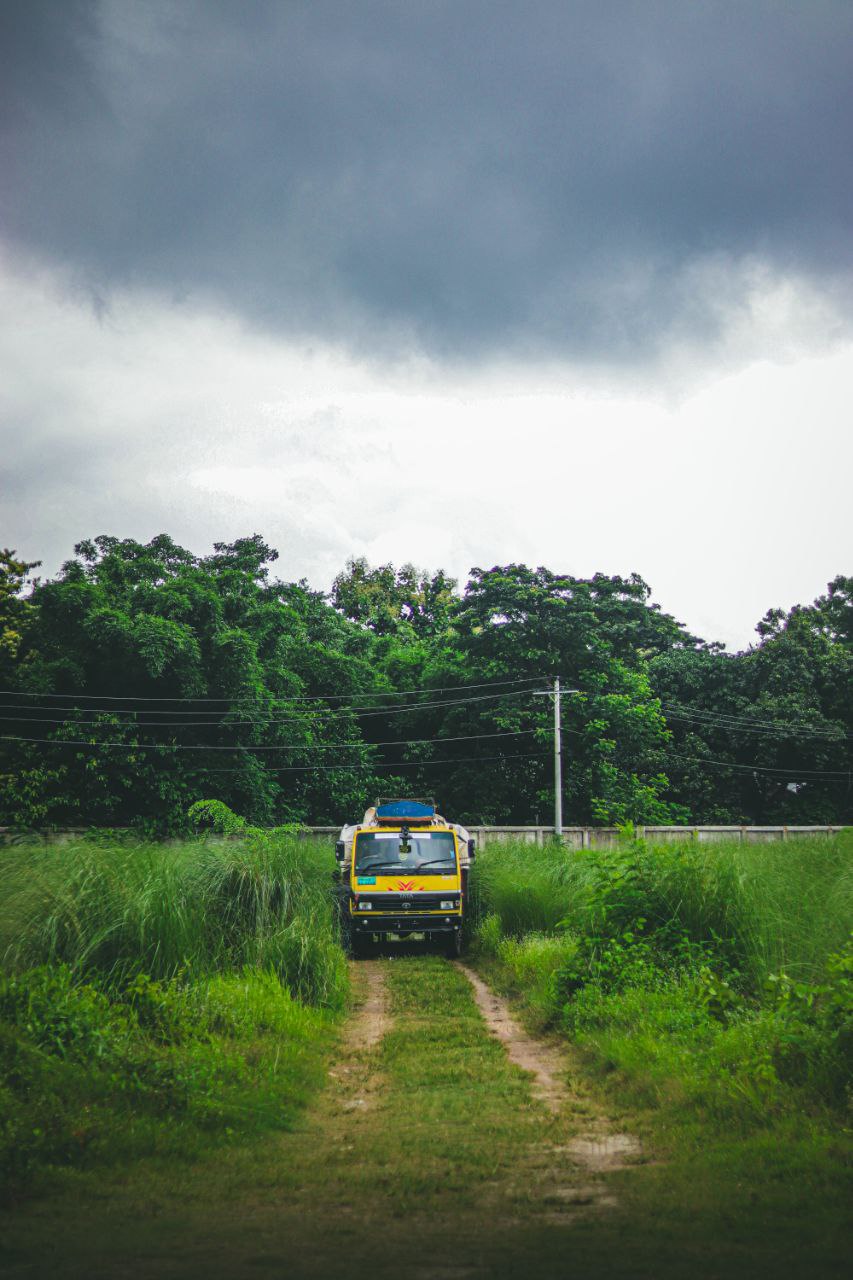 a yellow truck on a dirt road