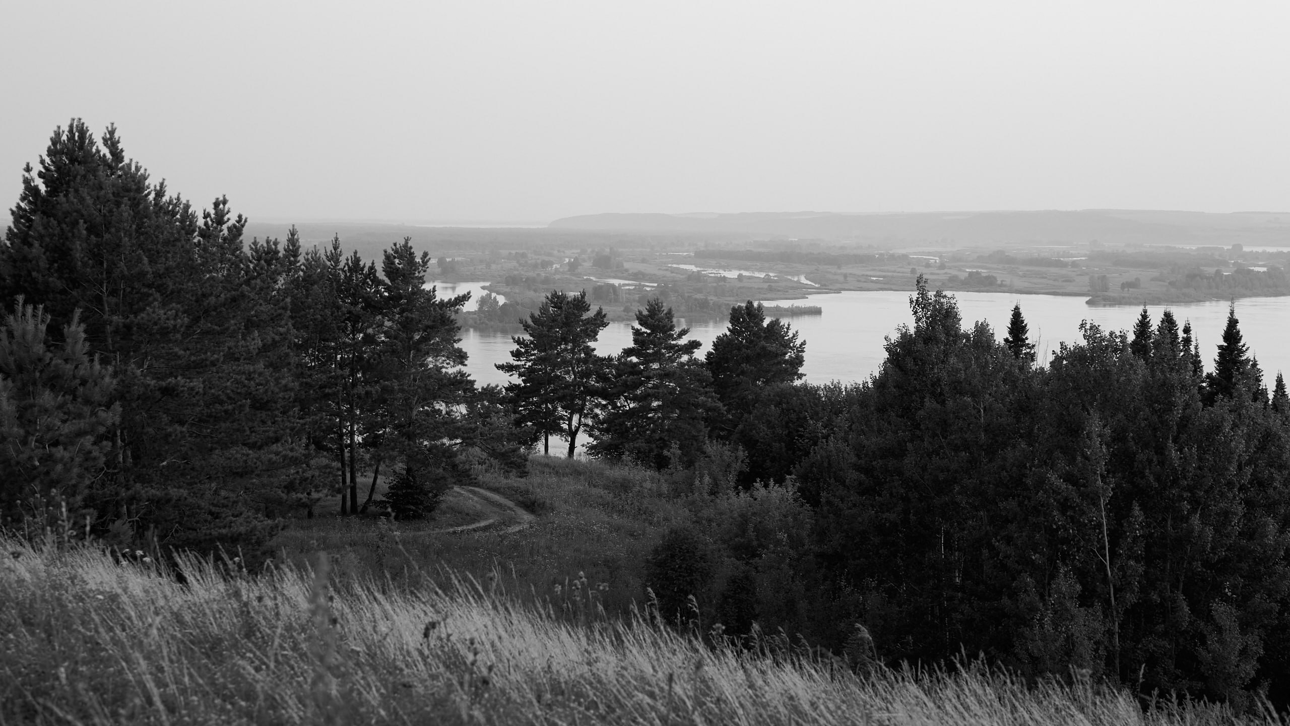a landscape with trees and a body of water in the background