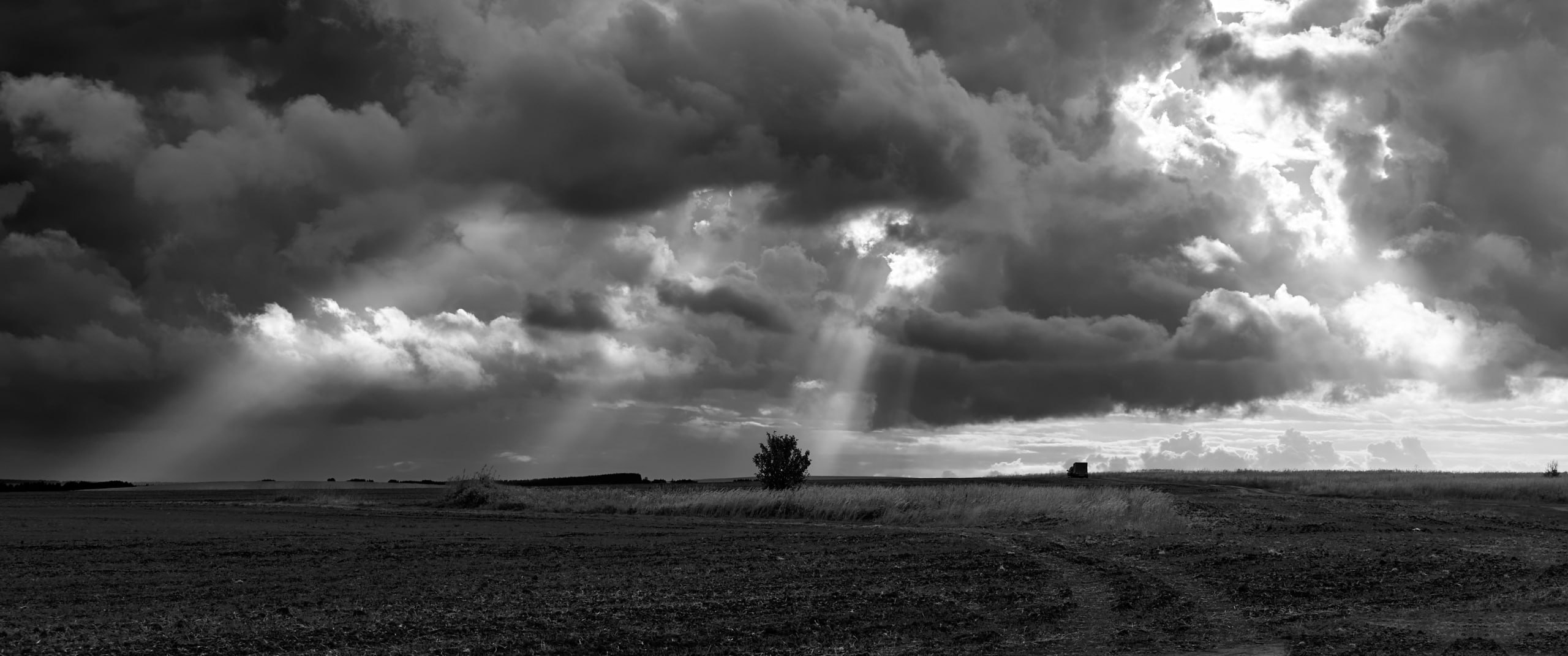 a large field with a tree in it and a cloudy sky above