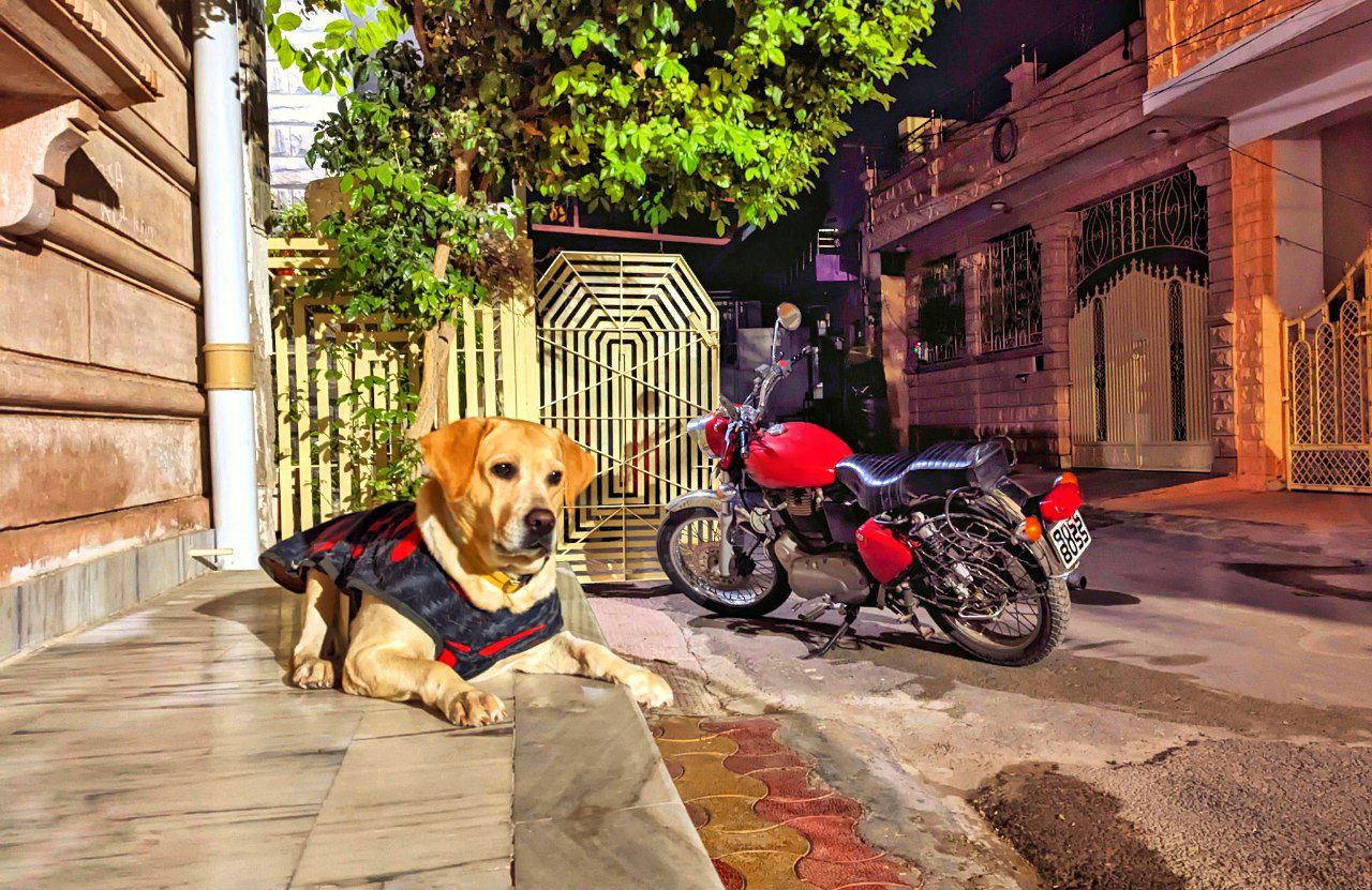 a dog sitting on a sidewalk