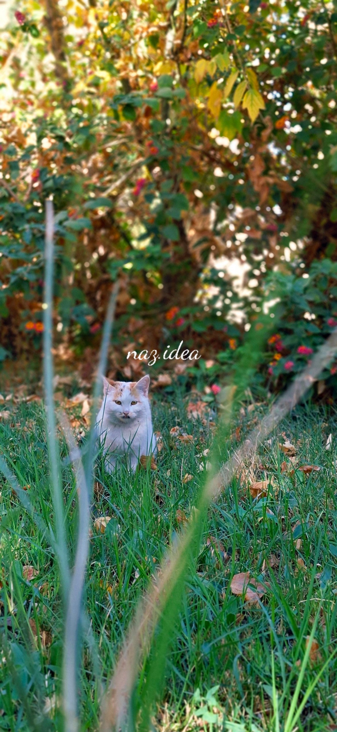 a cat sitting in a field of grass