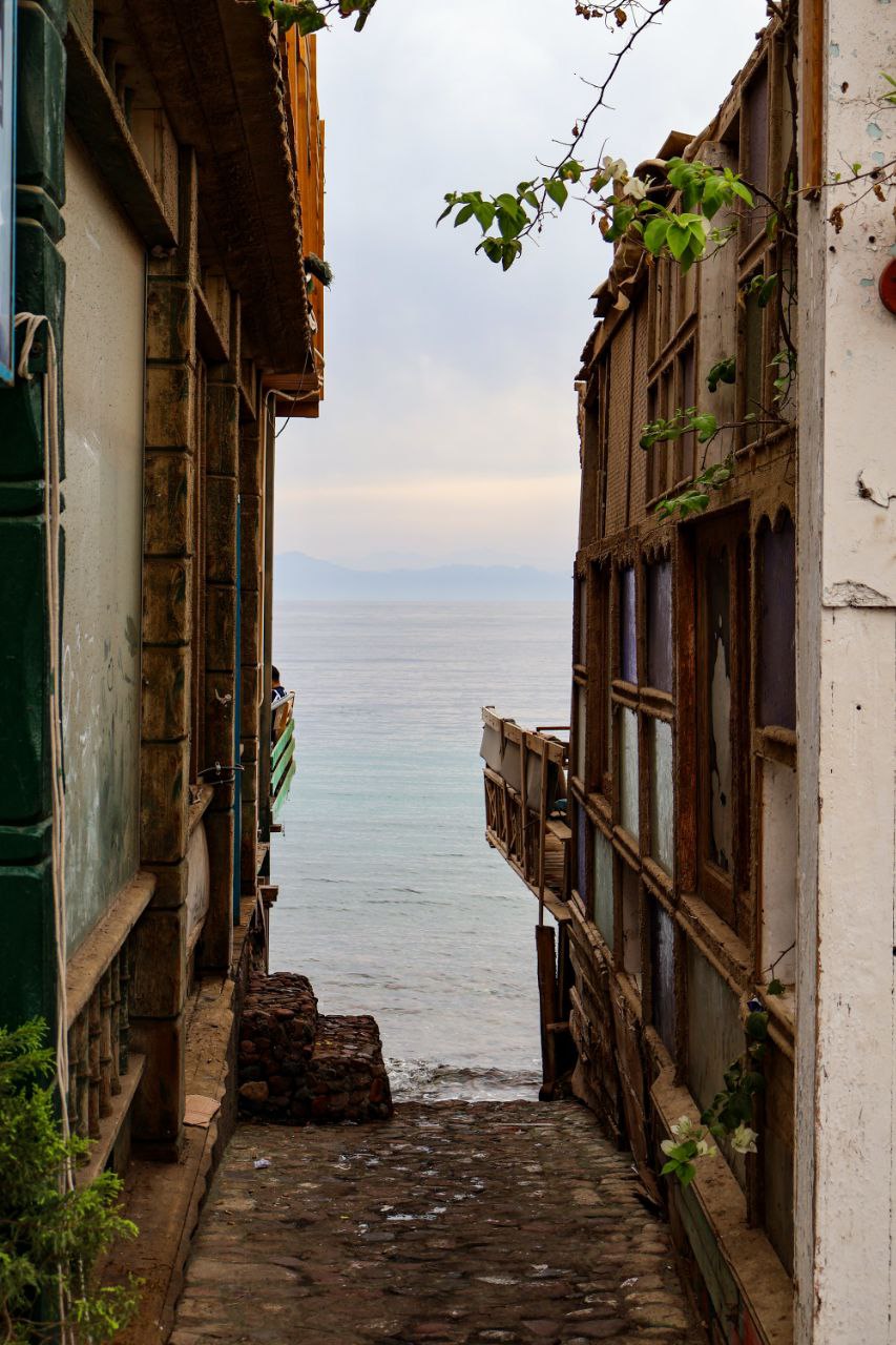 a narrow alley way with a body of water in the background