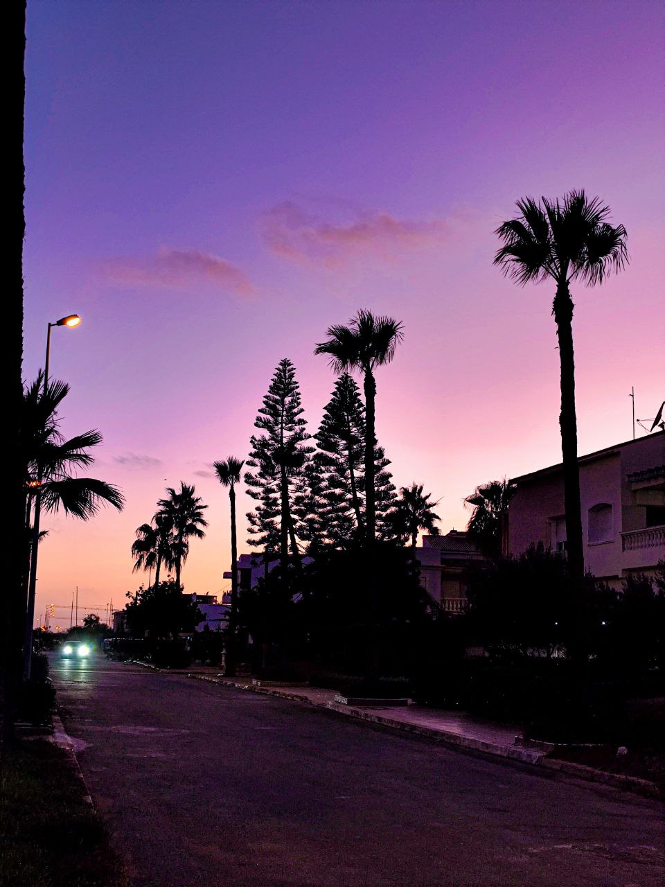 a street with palm trees and buildings