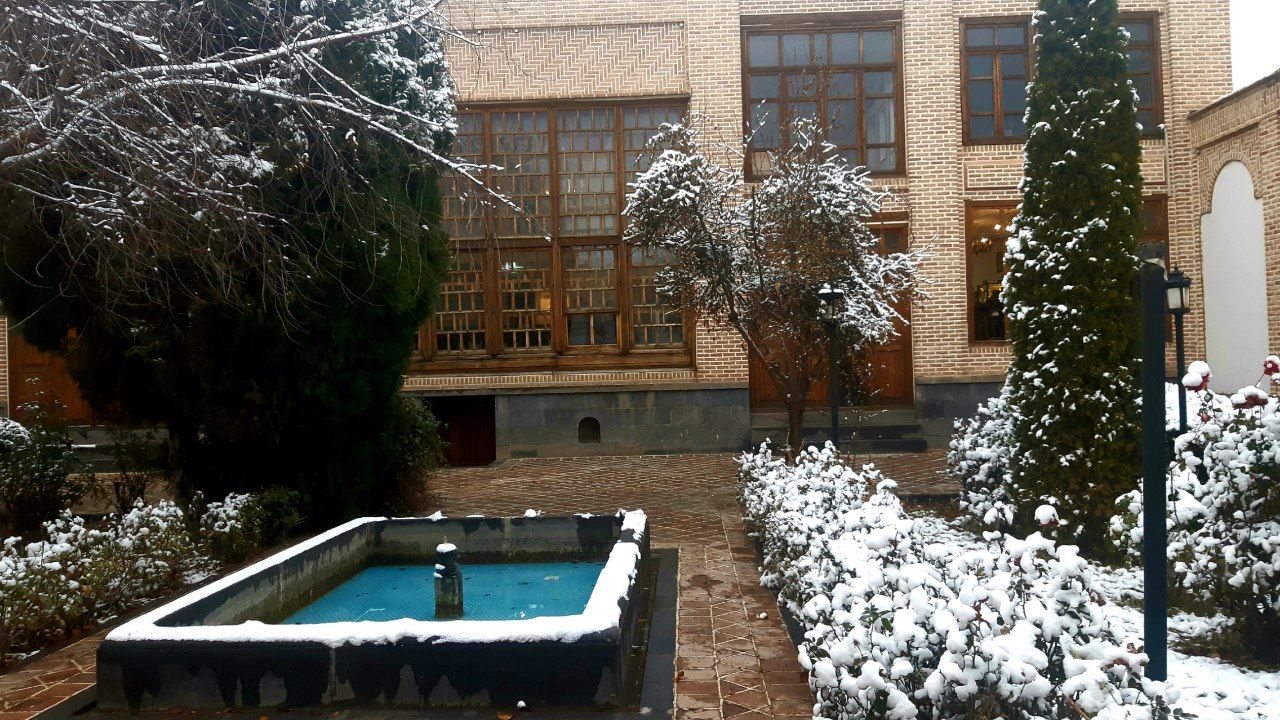 a swimming pool in front of a building with snow on the ground