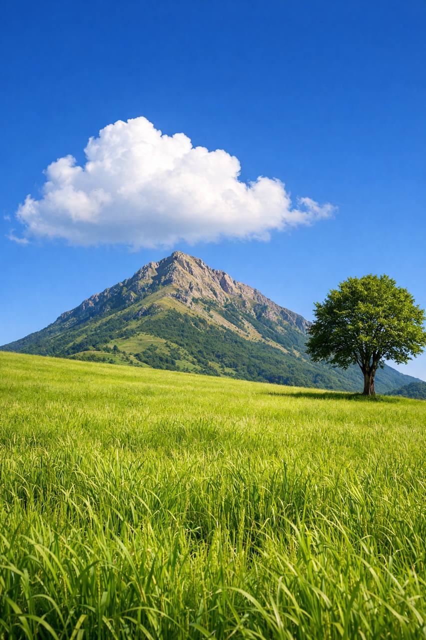 a grassy field with a tree and a mountain in the background