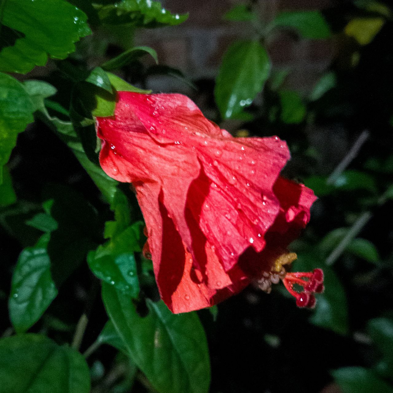 a red flower with green leaves