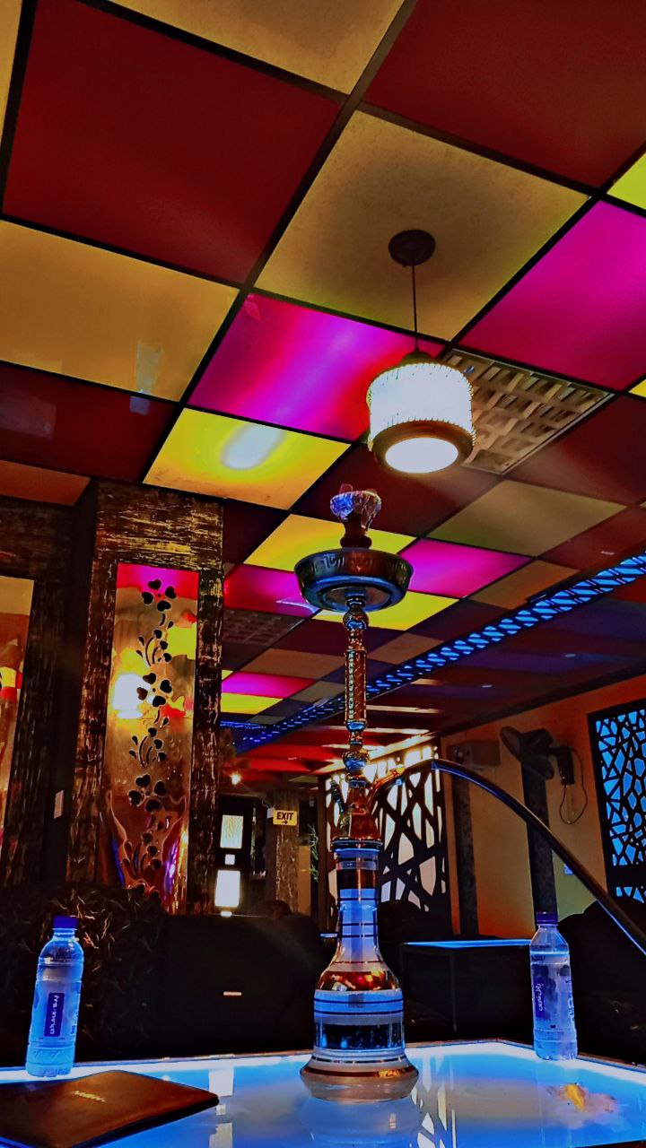 a table with a lamp and a glass bottle with a colorful ceiling